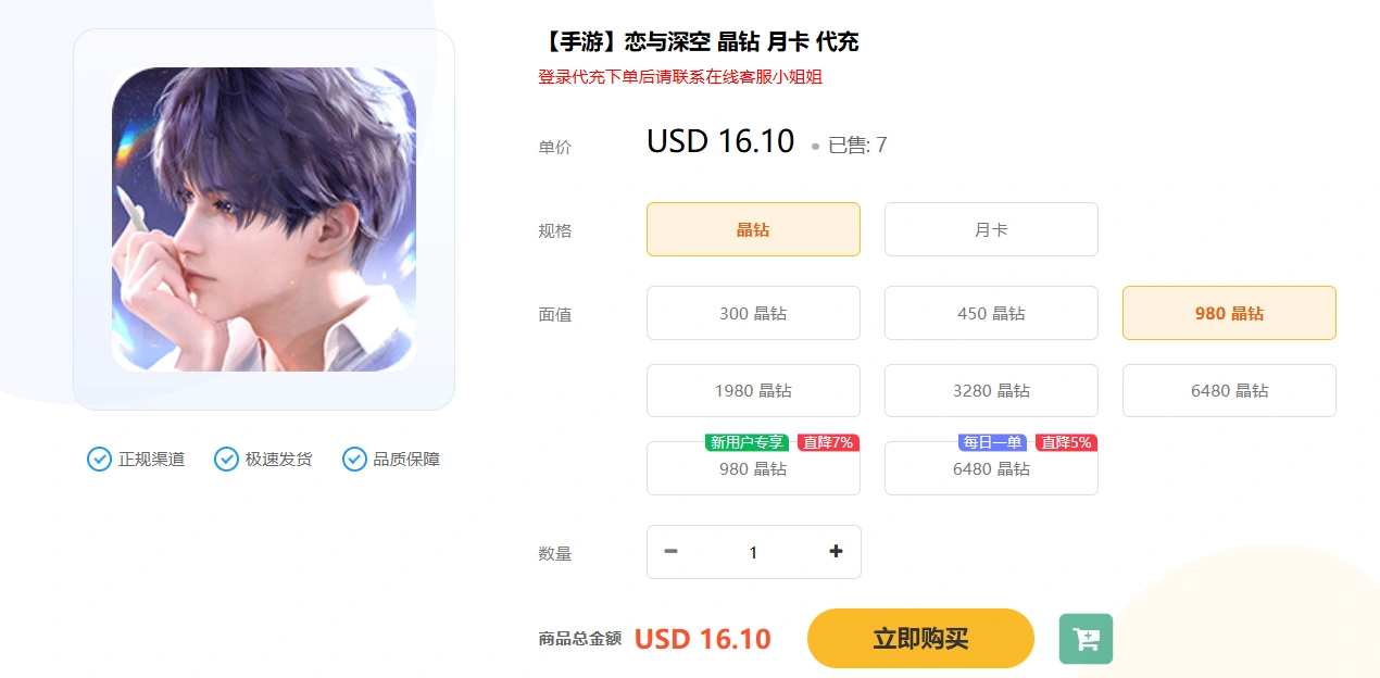 搜索《恋与深空》并选择所需项目(如晶钻、月卡)